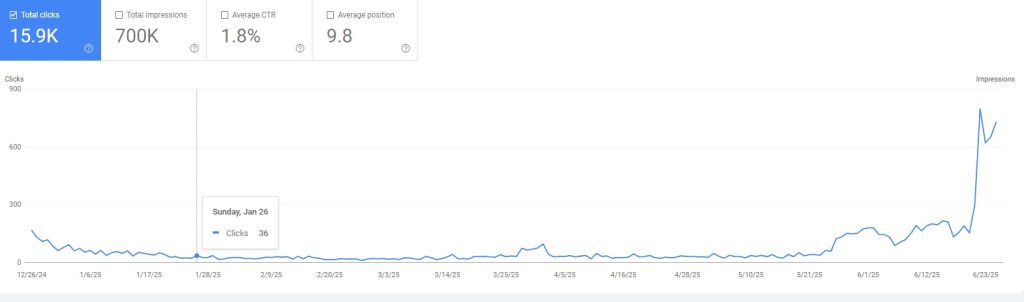 15.9K Tıklama | 700K Gösterim | 1.8% CTR | Ortalama Pozisyon: 9.8