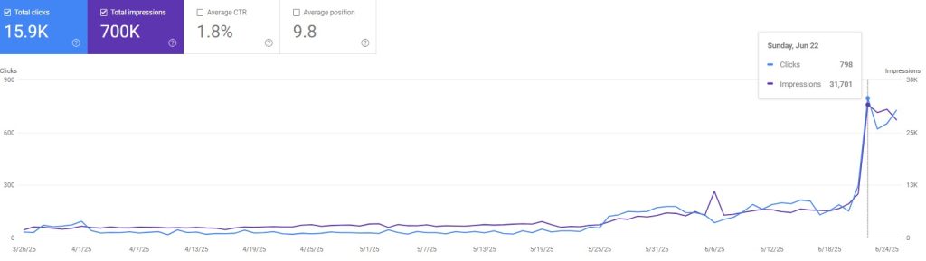 Bu müşterimizle çalışmaya başladığımızda günlük tıklama ortalaması yalnızca 30-50 civarındaydı. Yapılan teknik SEO ve içerik güncellemeleriyle Haziran sonuna doğru günlük tıklama 800 seviyesine çıktı.