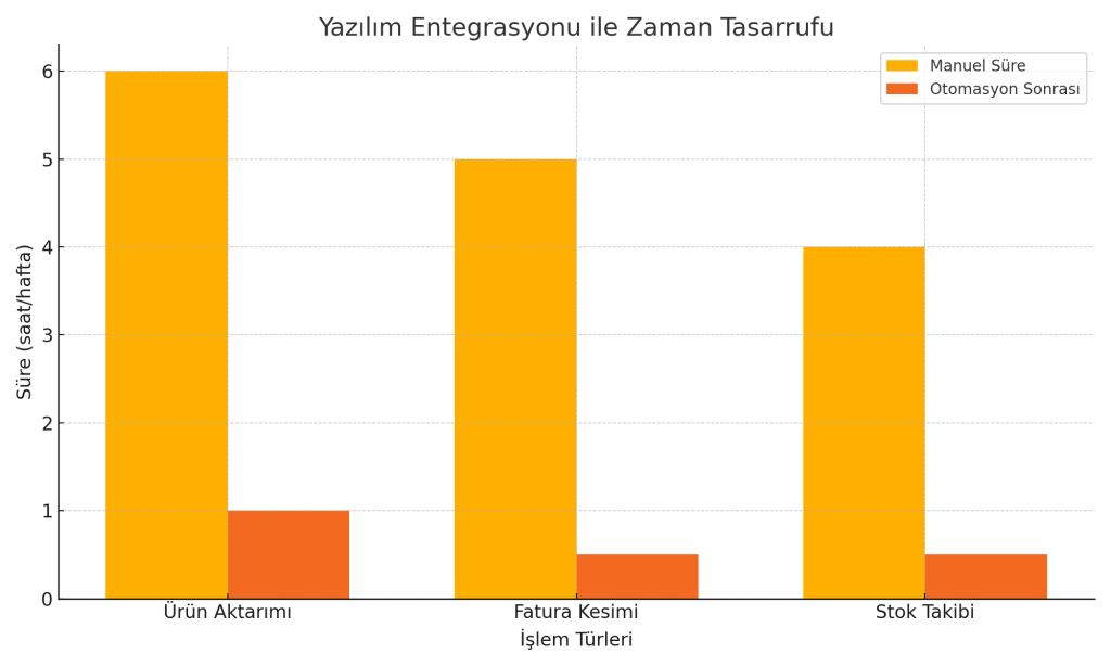 - Otomatik ürün aktarımı, fatura kesme, stok takibi